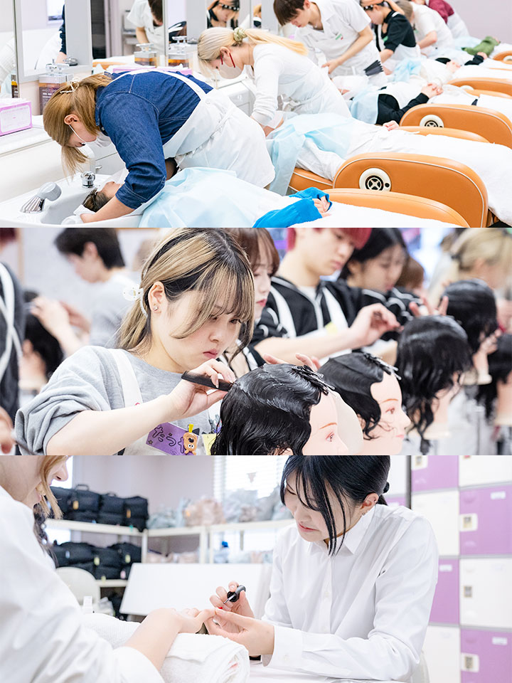 スクールで集中的に学んだ後、就職してからはより多くの実践訓練をすることで、早く実力が身につくと考えているため、学生のうちから実際のヘアメイクの現場に参加する現場実習や研修セミナーなどにも力を入れています。当校では色彩技能パーソナルカラー検定®を取り入れることによって、就職後も美容業界の幅広い分野で活躍できるアーティストを育成できると考えております。